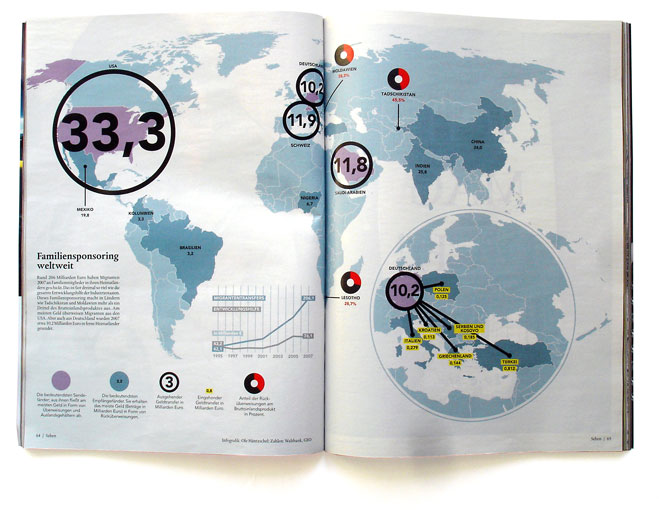 Worldmap showing money-transfers of migrants for NEON-magazine.