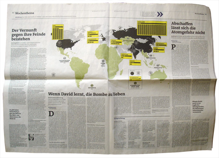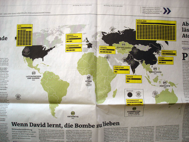 Worldmap showing nuclear weapons for the weekly newspaper Der Freitag
